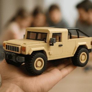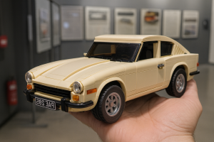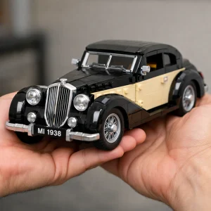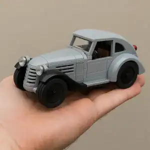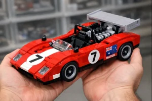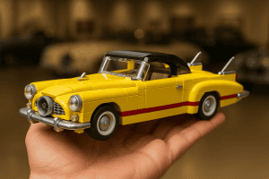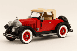 Bright LEGO vehicles and building blocks illustrating vintage car construction.